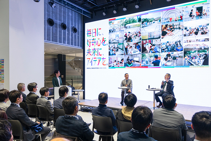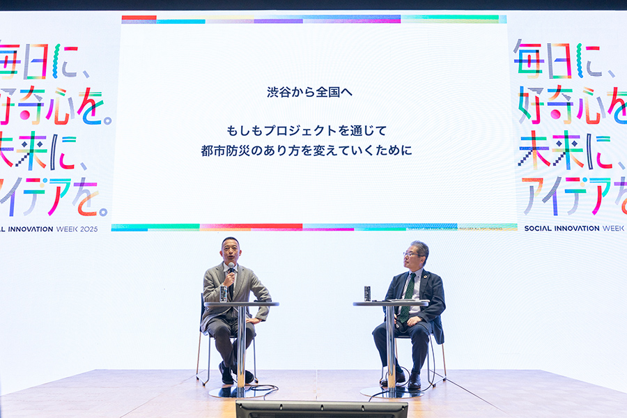 「もしもPJが見据える、都市防災の未来」では、長谷部健渋谷区長と、こくみん共済 coop専務理事の坂本隆浩さんが登壇。2021年3月に始動し、官民連携による防災共助を進める取り組みを展開してきた「もしもプロジェクト」の4年間を振り返りながら、東日本大震災から15年をむかえる2026年に向けた、持続的な防災共助のあり方についてトークセッションを行いました。