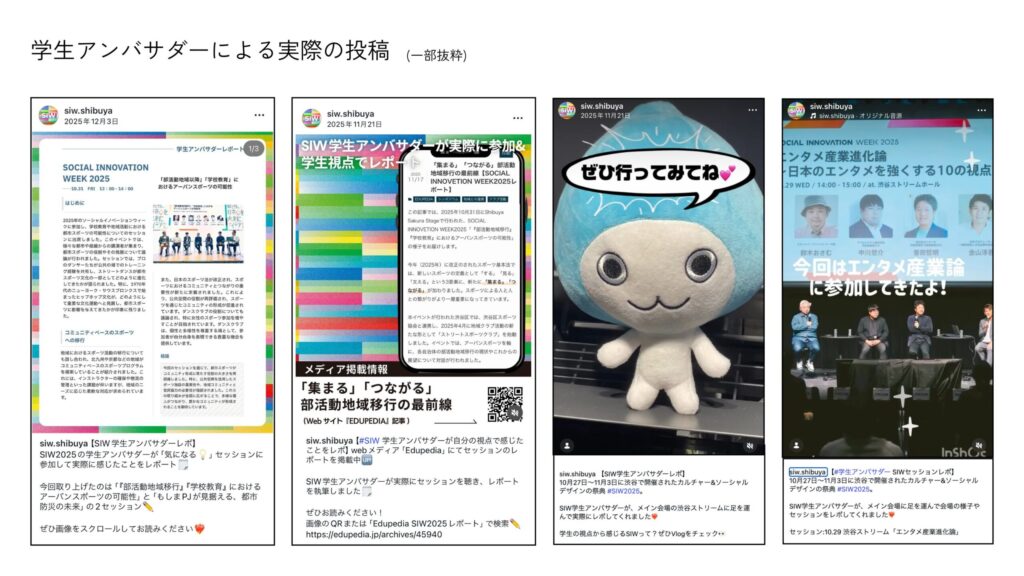 ソーシャル&カルチャーデザインの祭典「SOCIAL INNOVATION WEEK 2025(以下SIW)」は、学生が自由な視点やアイデア、クリエイティブを使って、SNS上でSIWの魅力を発信する「SIW2025学生アンバサダー」のプログラムを実施いたしました。